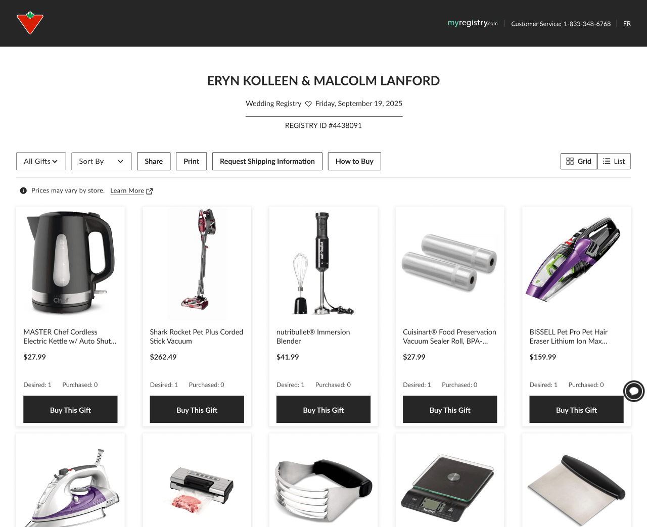 The co-branded navigation is live on this page: Canadian Tire logo on the left, MyRegistry on the right. The simplified nav proposal I made to stakeholders is what you see in production today.
